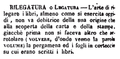 | Rilegatura, Legatura - L'arte di rilegare i libri, almeno come si esercita oggidì, non va debitrice della sua origine che alla scoperta della carta e della stampa, giacchè prima non si faceva altro che arrotolare (volvere, d'onde venne la parola volume) la pergamena ed i fogli in corteccie su cui erano scritti i libri. [immagine] |