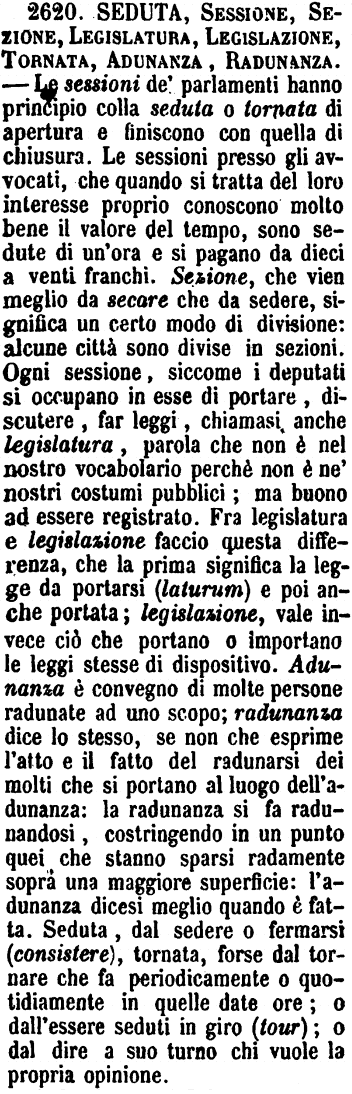 | Seduta, Sessione, Sezione, Legislatura, Legislazione, Tornata, Adunanza, Radunanza - Le sessioni de' parlamenti hanno principio colla seduta o tornata di apertura e finiscono con quella di chiusura. Le sessioni presso gli avvocati, che quando si tratta del loro interesse proprio conoscono molto bene il valore del tempo, sono sedute di un'ora e si pagano da dieci a venti franchi. Sezione, che vien meglio da secare che da sedere, significa un certo modo di divisione: alcune città sono divise in sezioni. Ogni sessione, siccome i deputati si occupano in esse di portare, discutere, far leggi, chiamasi anche legislatura, parola che non è nel nostro vocabolario perchè non è ne' nostri costumi pubblici; ma buono ad essere registrato. Fra legislatura e legislazione faccio questa differenza, che la prima significa la legge da portarsi (laturum) e poi anche portata; legislazione, vale invece ciò che portano o importano le leggi stesse di dispositivo. Adunanza è convegno di molte persone radunate ad uno scopo; radunanza dice lo stesso, se non che esprime l'atto e il fatto del radunarsi dei molti che si portano al luogo dell'adunanza: la radunanza si fa radunandosi, costringendo in un punto quei che stanno sparsi radamente sopra una maggiore superficie: l'adunanza dicesi meglio quando è fatta. Seduta, dal sedere o fermarsi (consistere), tornata, forse dal tornare che fa periodicamente o quotidianamente in quelle date ore; o dell'essere seduti in giro (tour); o dal dire a suo turno chi vuole la propria opinione. [immagine] |