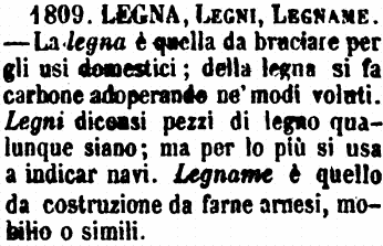 | Legna, Legne, Legni - Legne è il plurale meno comune dei rami e tronchi d'albero spezzati che si usano per ardere; che più comunemente si dice le legne. - Alcuni dicono la legna, in senso collettivo, per le legne, ma i buoni e schietti Toscani lo dicono di rado; nè è ragionevole il dirlo, perchè essendo le legna da ardere necessariamente più legni considerati insieme, il suo singolare è Legno, il quale legno fa nel plurale legni se vuol significare più legni a uno per uno, e non collettivamente Legni da ardere. [immagine] |