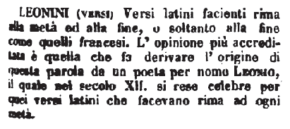 | Leonini (Versi) - Versi latini facienti rima alla metà ed alla fine, o soltanto alla fine come quelli francesi. L'opinione più accreditata è quella che fa derivare l'origine di questa parola da un poeta per nome Leonio, il quale nel secolo XII. si rese celebre per quei versi latini che facevano rima ad ogni metà. [immagine] |