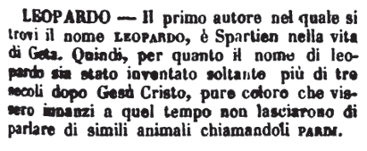 | Leopardo - Il primo autore nel quale si trovi il nome leopardo, è Spartien nella vita di Geta. Quindi, per quanto il nome di leopardo sia stato inventato soltanto più di tre secoli dopo Gesù Cristo, pure coloro che vissero innanzi a quel tempo non lasciarono di parlare di simili animali chiamandoli pardi . [immagine] |