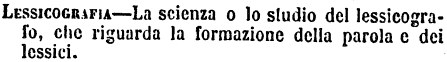 | Lessicografia - [T.] S. f. Arte e Pratica del comporre lessici e dell'usarne. Lessigrafia intitolò il Gherardini l'opera sua, dello scrivere le parole italiane, in senso aff. a Ortografia. Questo deriva da Λέξις, l'altra da Λεξικόν. |