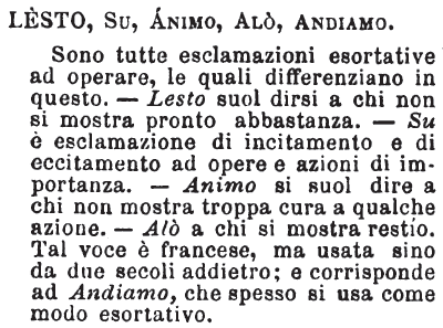| Lesto, Su, Animo, Alò, Andiamo - Sono tutte esclamazioni esortative ad operare, le quali differenziano in questo. - Lesto suol dirsi a chi non si mostra pronto abbastanza. - Su è esclamazione di incitamento e di eccitamento ad opere e azioni di importanza. - Animo si suol dire a chi non mostra troppa cura a qualche azione. - Alò a chi si mostra restìo. Tal voce è francese, ma usata sino da due secoli addietro; e corrisponde ad Andiamo, che spesso si usa come modo esortativo. [immagine] |