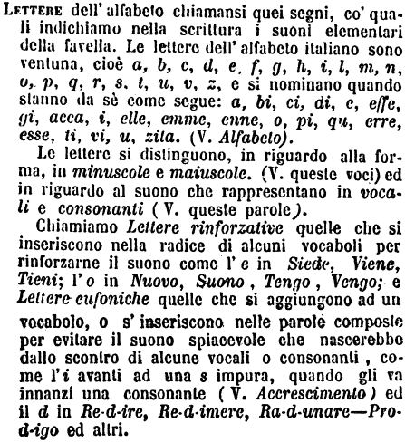 Le lettere si distinguono, in riguardo alla forma, in minuscole e maiuscole (V. queste voci) ed in riguardo al suono che rappresentano in vocali e consonanti (V. queste parole). Chiamiamo Lettere rinforzative quelle che si inseriscono nella radice di alcuni vocaboli per rinforzarne il suono come l'e in Siede, Viene, Tieni; l'o in Nuovo, Suono, Tengo, Vengo; e Lettere eufoniche quelle che si aggiungono ad un vocabolo, o s'inseriscono nelle parole composte per evitare il suono spiacevole che nascerebbe dallo scontro di alcune vocali o consonanti, come l'i avanti ad una s impura, quando gli va innanzi una consonante (V. Accrescimento) ed il d in Re-d-ire, Re-d-imere, Ra-d-unare - Pro-d-igo ed altri. [immagine] |