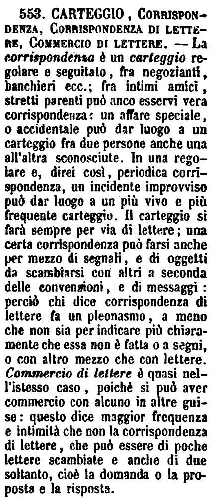 | Carteggio, Corrispondenza, Corrispondenza di lettere, Commercio di lettere - La corrispondenza è un carteggio regolare e seguitato, fra negozianti, banchieri ecc.; fra intimi amici, stretti parenti può anco esservi vera corrispondenza: un affare speciale, o accidentale può dar luogo a un carteggio fra due persone anche una all'altra sconosciute. In una regolare e, direi così, periodica corrispondenza, un incidente improvviso può dar luogo a un più vivo e più frequente carteggio. Il carteggio si farà sempre per via di lettere; una certa corrispondenza può farsi anche per mezzo di segnali, e di oggetti da scambiarsi con altri a seconda delle convenzioni, e di messaggi: perciò chi dice corrispondenza di lettere fa un pleonasmo, a meno che non sia per indicare più chiaramente che essa non è fatta o a segni, o con altro mezzo che con lettere. Commercio di lettere è quasi nell'istesso caso, poichè si può aver commercio con alcuno in altre guise: questo dice maggior frequenza e intimità che non la corrispondenza di lettere, che può essere di poche lettere scambiate e anche di due soltanto, cioè la domanda o la proposta e la risposta. [immagine] |