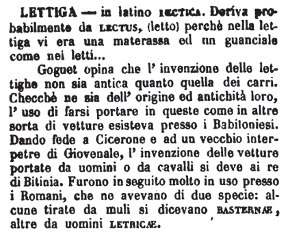 Lettiga - in latino lectica. Derìva probabilmente da lectus, (letto) perchè nella lettiga vi era una materassa ed un guanciale come nei letti...