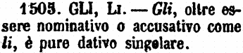 | Gli, Li - Gli, oltre essere nominativo o accusativo come li, è pure dativo singolare. [immagine] |