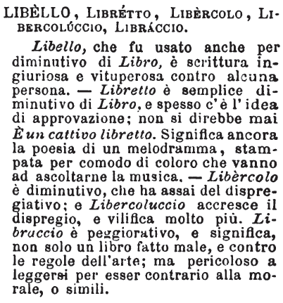 | Libello, Libretto, Libercolo, Libercoluccio, Libraccio - Libello, che fu usato anche per diminutivo di Libro, è scrittura ingiuriosa e vituperosa contro alcuna persona. - Libretto è semplice diminutivo di Libro, e spesso c'è l'idea di approvazione; non si direbbe mai E' un cattivo libretto. Significa ancora la poesia di un melodramma, stampata per comodo di coloro che vanno ad ascoltarne la musica. - Libèrcolo è diminutivo, che ha assai del dispregiativo; e Libercoluccio accresce il dispregio, e vilifica molto più. Libraccio è peggiorativo, e significa, non solo un libro fatto male, e contro le regole dell'arte; ma pericoloso a leggersi per esser contrario alla morale, o simili. [immagine] |