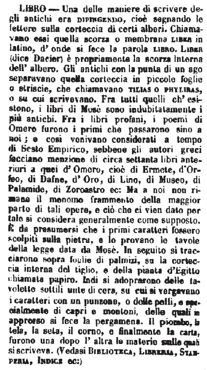 | Libro - Liber, che i Greci esprimevano colla parola Biblos, di cui abbiam fatto Bibbia, termine consacrato anticamente a denotare la Collezione intera dei Libri Santi, e che si chiama così semplicemente Libro per eccellenza. Abbiamo parlato nell'articolo Scrittura delle differenti materie corporee, sulle quali scrivevano gli Antichi, ma sarebbe avere una falsa idea della forma, ch'e' davano ai loro Libri se si giudicasse da quella dei nostri.