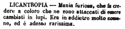 | Licantropia - Mania furiosa, che fa credere a coloro che ne sono attaccati di essere cambiati in lupi. Era in addietro molto comune, ed è adesso rarissima. [immagine] |