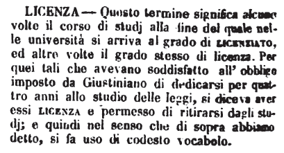 | Licenza - Questo termine significa alcune volte il corso di studj alla fine del quale nelle università si arriva al grado di licenziato, ed altre volte il grado stesso di licenza. Per quei tali che avevano soddisfatto all'obbligo imposto da Giustiniano di dedicarsi per quattro anni allo studio delle leggi, si diceva aver essi licenza e permesso di ritirarsi dagli studj; e quindi nel senso che di sopra abbiamo detto, si fa uso di codesto vocabolo. [immagine] |