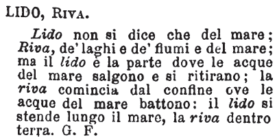 | Lido, Riva - Lido non si dice che del mare; Riva, de' laghi e de' fiumi e del mare; ma il lido è la parte dove le acque del mare salgono e si ritirano; la riva comincia dal confine ove le acque del mare battono: il lido si stende lungo il mare, la riva dentro terra. G. F. [immagine] |