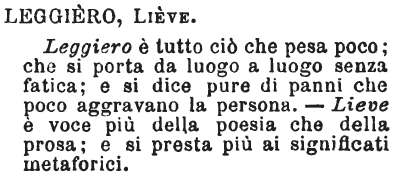 | Leggiero, Lieve - Leggiero è tutto ciò che pesa poco; che si porta da luogo a luogo senza fatica; e si dice pure di panni che poco aggravano la persona. - Lieve è voce più della poesia che della prosa; e si presta più ai significati metaforici. [immagine] |