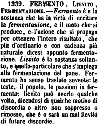 | Fermento, Lievito, Fermentazione - Fermento è e la sostanza che ha la virtù di eccitare la fermentazione, e il moto che si produce, e l'azione che si propaga per ottenere l'intero risultato, che più d'ordinario e con cadenza più naturale dicesi appunto fermentazione. Lievito è la sostanza soltanto, e quella particolare che s'impiega alla fermentazione del pane. Fermento ha senso traslato sovente: le teste, il popolo, le passioni in fermento: lievito può averlo qualche volta, dicendosi di qualche motivo di discordia o altro non soppresso o rimosso, che è o sarà un mal lievito di future discordie. [immagine] |