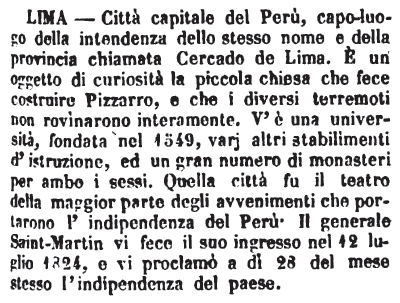 | Lima - Città capitale del Perù, capo-luogo della intendenza dello stesso nome e della provincia chiamata Cercado de Lima. E' un oggetto di curiosità la piccola chiesa che fece costruire Pizzarro, e che i diversi terremoti non rovinarono interamente. V'è una università, fondata nel 1549, varj altri stabilimenti d'istruzione, ed un gran numero di monasteri per ambo i sessi. Quella città fu il teatro della maggior parte degli avvenimenti che portarono l'indipendenza del Perù. Il generale Saint-Martin vi fece il suo ingresso nel 12 luglio 1824, e vi proclamò a dì 28 del mese stesso l'indipendenza del paese. [immagine] |