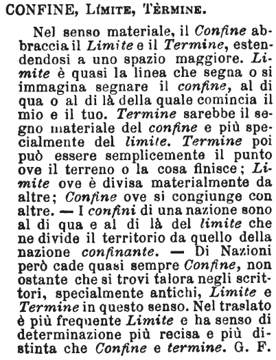 | Confine, Limite, Termine - Nel senso materiale, il Confine abbraccia il Limite e il Termine, estendendosi a uno spazio maggiore. Limite è quasi la linea che segna o si immagina segnare il confine, al di qua o al di là della quale comincia il mio e il tuo. Termine sarebbe il segno materiale del confine e più specialmente del limite. Termine poi può essere semplicemente il punto ove il terreno o la cosa finisce; Limite ove è divisa materialmente da altre; Confine ove si congiunge con altre. - I confini di una nazione sono al di qua e al di là del limite che ne divide il territorio da quello della nazione confinante. - Di Nazioni però cade quasi sempre Confine, non ostante che si trovi talora negli scrittori, specialmente antichi, Limite e Termine in questo senso. Nel traslato è più frequente Limite e ha senso di determinazione più recisa e più distinta che Confine e termine. G. F. [immagine] |