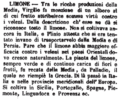 | Limone - Tra le ricche produzioni della Media, Virgilio fa menzione di un albero al di cui frutto attribuisce somma virtù contro i veleni. Dalla descrizione ch'esso ne dà si riconosce tosto il limone. Non si coltivava amcora in Italia, e Plinio attesta che si era tentato invano di trasportarvelo dalla Media e di Persia. Pare che il limone abbia maggiore efficacia contro i veleni nei paesi Orientali dove cresce naturalmente. La pianta del limone, sempre verde e di continuo carica di fiori e di frutti, fu recata dalla Media, da Palladio, il quale ne riempiè la Grecia. Di là passò in Italia e nelle provincie meridionali dell'Europa. Si coltiva in Sicilia, Portogallo, Spagna, Piemonte, Linguadoca e Provenza ec. [immagine] |