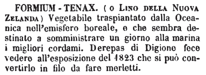| Formium - Tenax (o lino della Nuova Zelanda) - Vegetabile traspiantato dalla Oceanica nell'emisfero boreale, e che sembra destinato a somministrare un giorno alla marina i migliori cordami. Derepas di Digione fece vedere all'esposizione del 1823 che si può convertire in filo da fare merletti. [immagine] |