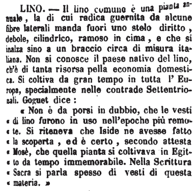 «Non è da porsi in dubbio, che le vesti di lino furono in uso nell'epoche più remote. Si riteneva che Iside ne avesse fatto la scoperta, ed è certo, secondo attesta Mosè, che quella pianta si coltivava in Egitto da tempo immemorabile. Nella Scrittura Sacra si parla spesso di vesti di questa materia.» [immagine] |