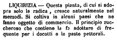 | Liquirizia - Questa pianta, di cui si adopra solo la radica, cresce naturalmente nel mezzodì. Si coltiva in alcuni paesi che ne fanno oggetto di commercio. Il principio zuccheroso che contiene la fa adottare di frequente per i decotti e le paste pettorali. [immagine] |