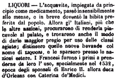 | Liquori - L'acquavite, impiegata da principio come medicamento, passò in sensibilmente alle mense, e in breve doventò la bibita preferita dal popolo. Allora gl'Italiani, più che le altre nazioni, procurarono di renderla piacevole al palato, e trovarono anche il modo di darle maggior pregio per uso delle classi agiate; distinsero quelle nuove bevande col nome di liquori, e le sparsero presso le nazioni estere. I Francesi furono i primi a prenderne da loro l'uso, specialmente nel 1532, epoca degli sponsali di Enrico II. allora duca d'Orleans con Caterina de' Medici. [immagine] |