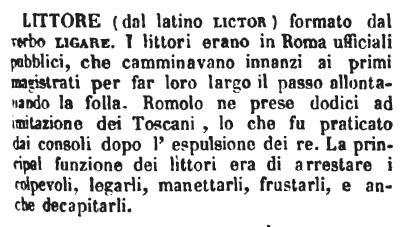 | Littore - (dal latino lictor) formato dal verbo ligare. I littori erano in Roma ufficiali pubblici, che camminavano innanzi ai primi magistrati per far loro largo il passo allontanando la folla. Romolo ne prese dodici ad imitazione dei Toscani, lo che fu praticato dai consoli dopo l'espulsione dei re. La principal funzione dei littori era di arrestare i colpevoli, legarli, manettarli, frustarli, e anche decapitarli. [immagine] |