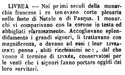 | Livrea - Nei primi secoli della monarchia francese i re tenevano corte plenaria nelle feste di Natale e di Pasqua. I monarchi vi comparivano con la corona in testa ed abbigliati sfarzosamente. Accoglievano splendidamente i grandi signori, li trattavano con magnificenza, e davano ed essi (leur livraient) penne, abiti ricchissimi ec:, dal che venne il termine di livrée, conservatosi per le vesti che i signori fanno portare oggidì dai loro servitori. [immagine] |
