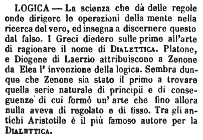 | Logica - La scienza che dà delle regole onde dirigere le operazioni della mente nella ricerca del vero, ed insegna a discernere questo dal falso. I Greci diedero sulle prime all'arte di ragionare il nome di Dialettica. Platone, e Diogene di Laerzio attribuiscono a Zenone da Elea l'invenzione della logica. Sembra dunque che Zenone sia stato il primo a trovare quella serie naturale di principii e di conseguenze di cui formò un'arte che fino allora nulla aveva di regolato e di fisso. Tra gli antichi Aristotile è il più famoso autore per la Dialettica. [immagine] |