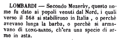 | Lombardi - Secondo Mezeràv, questo nome fu dato ai popoli venuti dal Nord, i quali verso il 568 si stabilirono in Italia, o perchè avevano lunga la barba, o perchè si armavano di long-bards, ch'era una specie di arme in asta. [immagine] |