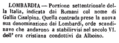 | Lombardia - Porzione settentrionale della Italia, indicata dai Romani col nome di Gallia Cisalpina. Quella contrada prese la nuova sua denominazione dai Lombardi, orde scandinave che andarono a stabilirvisi nel secolo VI. dell'era cristiana condottivi da Alboino. [immagine] |