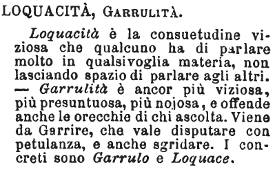 | Loquacità, Garrulità - Loquacità è la consuetudine viziosa che qualcuno ha di parlare molto in qualsivoglia materia, non lasciando spazio di parlare agli altri. - Garrulità è ancor più viziosa, più presuntuosa, più nojosa, e offende anche le orecchie di chi ascolta. Viene da Garrire, che vale disputare con petulanza, e anche sgridare. I concreti sono Garrulo e Loquace. [immagine] |