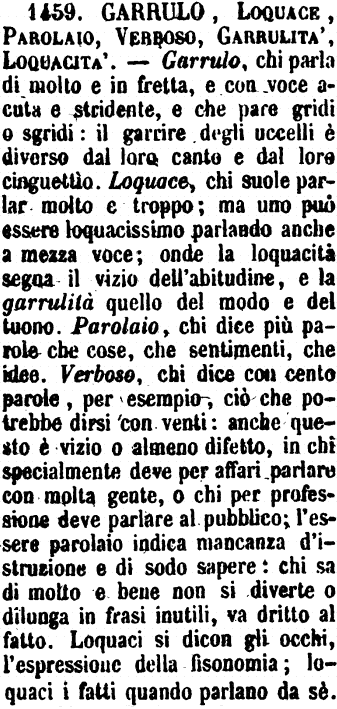 | Garrulo, Loquace, Parolaio, Verboso, Garrulità, Loquacità - Garrulo, chi parla di molto e in fretta, e con voce acuta e stridente, e che pare gridi o sgridi: il garrire degli uccelli è diverso dal loro canto e dal loro cinguettìo. Loquace, chi suole parlar molto e troppo; ma uno può essere loquacissimo parlando anche a mezza voce; onde la loquacità segna il vizio dell'abitudibe, e la garrulità quello del modo e del tuono. Parolaio, chi dice più parole che cose, che sentimenti, che idee. Verboso, chi dice con cento parole, per esempio, ciò che potrebbe dirsi con venti: anche questo è vizio o almeno difetto, in chi specialmente deve per affari parlare con molta gente, o chi per professione deve parlare al pubblico; l'essere parolaio indica mancanza d'istruzione e di sodo sapere: chi sa di molto e bene non si diverte o dilunga in frasi inutili, va dritto al fatto. Loquaci si dicon gli occhi, l'espressione della fisonomia; loquaci i fatti quando parlano da sè. [immagine] |