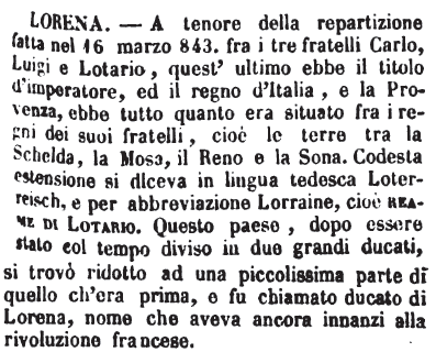 | Lorena - A tenore della repartizione fatta nel 16 marzo 843. fra i tre fratelli Carlo, Luigi e Lotario, quest'ultimo ebbe il titolo d'imperatore, ed il regno d'Italia, e la Provenza, ebbe tutto quanto era situato fra i regni dei suoi fratelli, cioè le terre tra la Schelda, la Mosa, il Reno e la Sona. Codesta estensione si diceva in lingua tedesca Loterreisch, e per abbreviazione Lorraine, cioè reame di Lotario. Questo paese, dopo essere stato col tempo diviso in due grandi ducati, si trovò ridotto ad una piccolissima parte di quello ch'era prima, e fu chiamato ducato di Lorena, nome che aveva ancora innanzi alla rivoluzione francese. [immagine] |