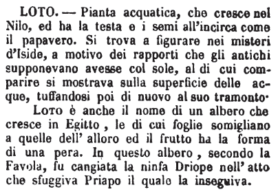 | Loto - Pianta acquatica, che cresce nel Nilo, ed ha la testa e i semi all'incirca come il papavero. Si trova a figurare nei misteri d'Iside, a motivo dei rapporti che gli antichi supponevano avesse col sole, al di cui comparire si mostrava sulla superficie delle acque, tuffandosi poi di nuovo al suo tramonto.