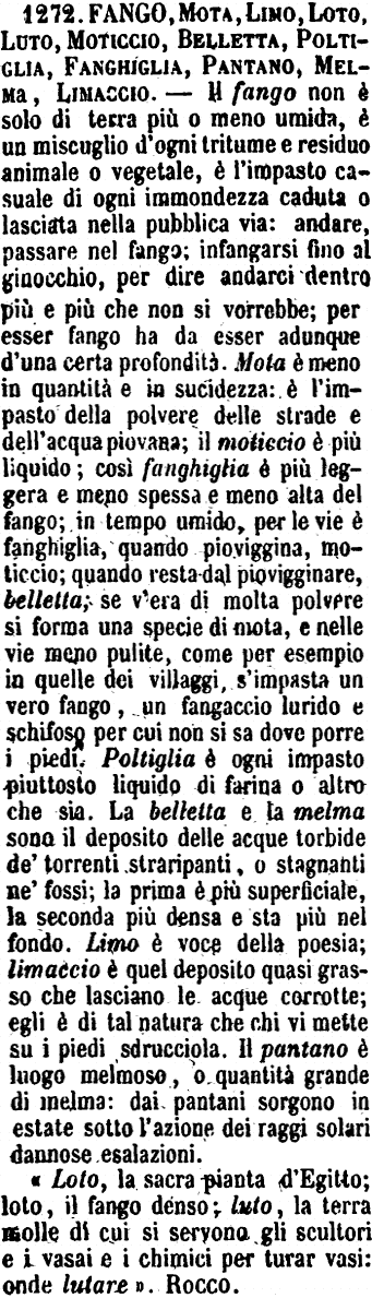 | Fango, Mota, Limo, Loto, Luto, Moticcio, Belletta, Poltiglia, Fanghiglia, Pantano, Melma, Limaccio - Il fango non è solo di terra più o meno umida, è un miscuglio d'ogni tritume e residuo animale o vegetale, è l'impasto casuale di ogni immondezza caduta o lasciata nella pubblica via: andare, passare nel fango; infangarsi fino al ginocchio, per dire andarci dentro più e più che non si vorrebbe; per esser fango ha da esser adunque d'una certa profondità. Mota è meno in quantità e in sucidezza: è l'impasto della polvere delle strade e dell'acqua piovana; il moticcio è più liquido; così fanghiglia è più leggera e meno spessa e meno alta del fango; in tempo umido, per le vie è fanghiglia, quando pioviggina, moticcio; quando resta dal piovigginare, belletta; se v'era di molta polvere si forma una specie di mota, e nelle vie meno pulite, come per esempio in quelle dei villaggi, s'impasta un vero fango, un fangaccio lurido e schifoso per cui non si sa dove porre i piedi. Poltiglia è ogni impasto piuttosto liquido di farina o altro che sia. La belletta e la melma sono il deposito delle acque torbide de' torrenti straripanti, o stagnanti ne' fossi; la prima è più superficiale, la seconda più densa e sta più nel fondo. Limo è voce della poesia; limaccio è quel deposito quasi grasso che lasciano le acque corrotte; egli è di tal natura che chi vi mette su i piedi sdrucciola. Il pantano è luogo melmoso, o quantità grande di melma: dai pantani sorgono in estate sotto l'azione dei raggi solari dannose esalazioni.