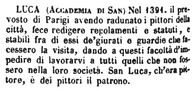 | Luca (Accademia di San) - Nel 1391 il prevosto di Parigi avendo radunato i pittori della città, fece redigere regolamenti e statuti, e stabilì fra di essi de' giurati e guardie che facessero la visita, dando a questi facoltà d'impedire di lavorarvi a tutti quelli che non fossero nella loro società. San Luca, ch'era pittore, è dei pittori il patrono. [immagine] |