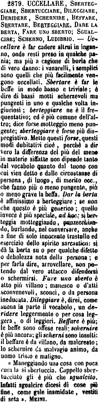 | Uccellare, Sberteggiare, Sbertucciare, Dileggiare, Deridere, Schernire, Beffare, Sbertare, Berteggiare, Dare la berta, Fare uno sberto; Sgualcire; Scherno, Ludibrio - Uccellare è far cadere altrui in inganno, onde resti preso in qualche pania; ma più a cagione di burla che di vero danno: i vanarelli, i semplici sono quelli che più facilmente vengono uccellati. Sbertare è far le beffe in modo basso e triviale; è dire di bassi motti scherzevoli ma pungenti in uno e qualche volta ingiuriosi; berteggiare ne è il frequentativo; ed è più comune dell'altro; dice forse motteggio meno pungente; sberteggiare è forse più dispregiativo. Metto questi forse, questi modi dubitativi cioè, perchè a dir vero la differenza del più del meno in materie siffatte non dipende tanto dal vocabolo quanto dal tuono con cui vien detto e dalle circostanze di persona, di luogo, di merito ecc., che fanno più o meno pungente, più o meno grave la beffa. Dar la berta è affinissimo a berteggiare; se non che questo è più generico; quello invece è più speciale, ad hoc; si berteggia motteggiando, punzecchiando, burlando, nel conversare, anche a fine di solo innocente trastullo ed esercizio dello spirito sarcastico; si dà la berta su o per qualche difetto o debolezza nota della persona; e per farla dire, arrovellare, non potendo dal vero attacco difendersi o schermirsi. Fare uno sberto è atto più villano; manesco o d'atti sconvenevoli, sconci, o da persona ineducata. Dileggiare è, direi, come suona in parte il vocabolo, un deridere leggermente o per cosa leggera, o di leggieri. Beffare è più; le beffe sono offese reali; schernire è più ancora; gli scherni sono insulti: il beffare è da villano, da malcreato; lo schernire da malvagio animo, da uomo tristo e maligno.