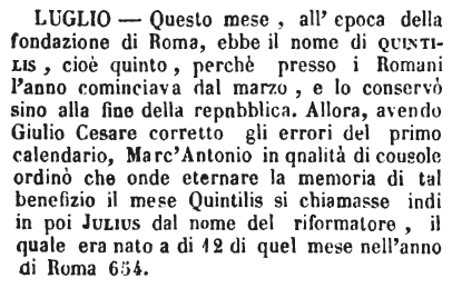 | Luglio - Mese dell'Anno così chiamato da Giulio Cesare. I Romani avanti di questo Imperatore lo chiamavano Quintilis, perchè era il quinto Mese dell'Anno quando questo incominciava da Marzo. |