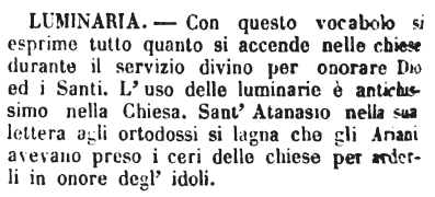 | Luminaria - Con questo vocabolo si esprime tutto quanto si accende nelle chiese durante il servizio divino per onorare Dio ed i Santi. L'uso delle luminarie è antichissimo nella Chiesa. Sant'Atanasio nella sua lettera agli ortodossi si lagna che gli Ariani avevano preso i ceri delle chiese per arderli in onore degl'idoli. [immagine] |