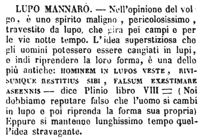 | Lupo mannaro - Nell'opinione del volgo, è uno spirito maligno, pericolosissimo, travestito da lupo, che gira pei campi e per le vie notte tempo. L'idea superstiziosa che gli uomini potessero essere cangiati in lupi, e indi riprendere la loro forma, è una delle più antiche: hominem in lupos veste, rivisumque restitius sibi, falsum exestimare aseennis - dice Plinio libro VIII = (Noi dobbiamo reputare falso che l'uomo si cambi in lupo e poi riprenda la forma sua propria) Eppure si mantenne lunghissimo tempo quell'idea stravagante. [immagine] |