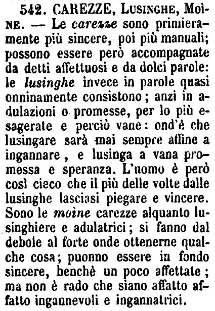 | Carezze, Lusinghe, Moine - Le carezze sono primieramente più sincere, poi più manuali; possono essere però accompagnate da detti affettuosi e da dolci parole: le lusinghe invece in parole quasi onninamente consistono; anzi in adulazioni o promesse, per lo più esagerate e perciò vane: ond'è che lusingare sarà mai sempre affine a ingannare, e lusinga a vana promessa e speranza. L'uomo è però così cieco che il più delle volte dalle lusinghe lasciasi piegare e vincere. Sono le moìne carezze alquanto lusinghiere e adulatrici; si fanno dal debole al forte onde ottenerne qualche cosa; puonno essere in fondo sincere, benchè un poco affettate; ma non è rado che siano affatto affatto ingannevoli e ingannatrici. [immagine] |