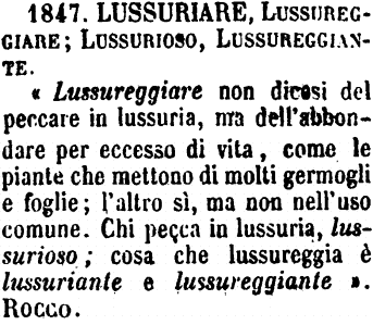| Lussuriare, Lussureggiare; Lussurioso, Lussureggiante - «Lussureggiare non dicesi del peccare in lussuria, ma dell'abbondare per eccesso di vita, come le piante che mettono di molti germogli e foglie; l'altro sì, ma non nell'uso comune. Chi pecca in lussuria, lussurioso; cosa che lussureggia è lussuriante e lussureggiante». Rocco. [immagine] |