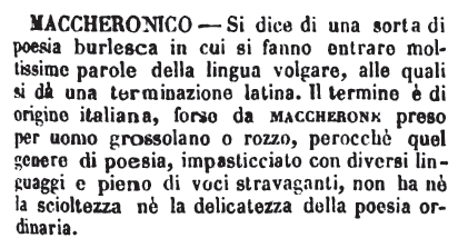 | Maccheronico - Si dice di una sorta di poesia burlesca in cui si fanno entrare moltissime parole della lingua volgare, alle quali si dà una terminazione latina. Il termine è di origine italiana, forse da maccherone preso per uomo grossolano o rozzo, perocchè quel genere di poesia, impasticciato con diversi linguaggi e pieno di voci stravaganti, non ha né la scioltezza né la delicatezza della poesia ordinaria. [immagine] |