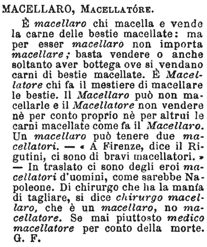 | Macellaro, Macellatore - E' macellaro chi macella e vende la carne delle bestie macellate: ma per esser macellaro non importa macellare; basta vendere o anche soltanto aver bottega ove si vendano carni di bestie macellate. E' Macellatore chi fa il mestiere di macellare le bestie. Il Macellaro può non macellarle e il Macellatore non vendere nè per conto proprio nè per altrui le carni macellate come fa il Macellaro. Un macellaro può tenere due macellatori. - «A Firenze, dice il Rigutini, ci sono di bravi macellatori.» - In traslato ci sono degli eroi macellatori d'uomini, come sarebbe Napoleone. Di chirurgo che ha la manía di tagliare, si dice chirurgo macellaro, che è un macellaro, no macellatore. Se mai piuttosto medico macellatore per conto della morte. G. F. [immagine] |