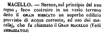 | Macello - Nerone, sul principio del suo regno, fece costruire in un vasto terreno detto il gran mercato un superbo edifizio provvisto di acqua corrente, ad uso dei macellaj, che fu chiamato il Gran macello (Vedi ammazzatoj) [immagine] |