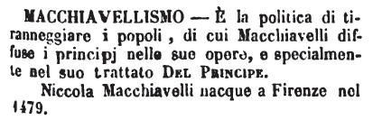 | Macchiavellismo - E' la politica di tiranneggiare i popoli, di cui Macchiavelli diffuse i principj nelle sue opere, e specialmente nel suo trattato Del Principe.