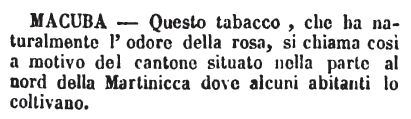 | Macuba - Questo tabacco, che ha naturalmente l'odore di rosa, si chiama così a motivo del cantone situato nella parte al nord della Martinicca dove alcuni abitanti lo coltivano. [immagine] |