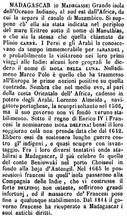 | Madagascar (o Madegasse) - Grande isola dell'Oceano Indiano, al sud est dall'Africa, da cui la separa il canale di Mozambico. Si suppone ch'ella sia stata indicata nel peripleo del mare Eritreo sotto il nome di Manuthias, e che sia la stessa che quella chiamata da Plinio carnè. I Persi e gli Arabi la conoscevano da tempo immemorabile per sarandel, e probabilmente la visitarono nei loro primi viaggi alle Indie: alcuni loro geografi le diedero il nome di isola della luna. Nulladimeno Marco Polo è quello che ha trasmesso all'Europa le prime nozioni positive su quella contrada. Sembra che nel medio evo, al pari della costa Orientale dell'Africa, cadesse in potere degli Arabi. Lorenzo Almeida, navigatore portoghese, la scuoprì soltanto nel 1506, ma il suo governo non vi fondò veruno stabilimento. Sotto il regno di Enrico IV i Francesi la nominarono isola delfina: bensì il loro soggiorno colà non prende data che dal 1642. Ebbero essi da sostenere lunghe guerre contro gl'indigeni, e quasi sempre con isvantaggio. Fra i loro diversi tentativi onde stabilirsi a Madagascar, il più celebre fu quello del conte Beniowski nel porto Choiseul in fondo alla baja d'Antongil. Nel 1665 le possessioni francesi in quell'isola passarono alla Compagnia delle Indie, che vi costrusse il forte delfino; non ostante, soffrirono grandi infortunj, ed il massacro de' Francesi pose fine a qualunque stabilimento. Dal 1814 il governo francese ha ricuperato a Madagascar i suoi antichi diritti. [immagine] |