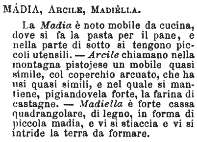 | Madia, Arcile, Madiella - La Madia è noto mobile da cucina, dove si fa la pasta per il pane, e nella parte di sotto si tengono piccoli utensili. - Arcile chiamano nella montagna pistojese un mobile quasi simile, col coperchio arcuato, che ha usi quasi simili, e nel quale si mantiene, pigiandovela forte, la farina di castagne. - Madiella è forte cassa quadrangolare, di legno, in forma di piccola madia, e vi si stiaccia e vi si intride la terra da formare. [immagine] |