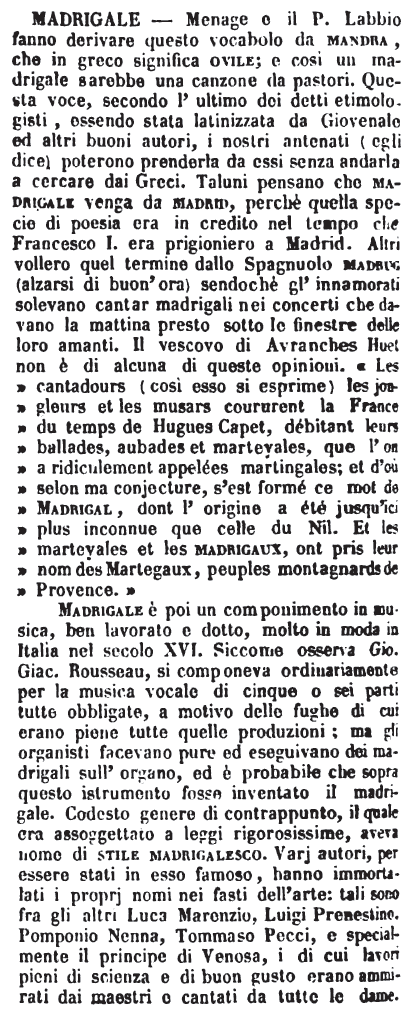 Madrigale - Menage e il P. Labbio fanno derivare questo vocabolo da mandra, che in greco significa ovile; e così un madrigale sarebbe una canzone da pastori. Questa voce, secondo l’ultimo dei detti etimologisti, essendo stata latinizzata da Giovenale ed altri buoni autori, i nostri antenati (egli dice) poterono prenderla da essi senza andarla a cercare dai Greci. Taluni pensano che madrigale venga da madrid, perché quella specie di poesia era in credito nel tempo che Francesco I. era prigioniero a Madrid. Altri vollero quel termine dallo Spagnuolo madrug (alzarsi di buon’ora) sendochè gl’innamorati solevano cantar madrigali nei concerti che davano la mattina presto sotto le finestre delle loro amanti. Il vescovo di Avranches Huet non è di alcuna di queste opinioni. «Les cantadours (così esso si esprime) les jongleurs et les musars coururent la France du temps de Hugues Capet, débitant leurs ballades, aubades et marteyales, que l’on a ridiculement appelées martingales; et d’ou selon ma conjecture, s’est formé ce mot de Madrigal, dont l’origine a été jusqu’ici plus inconnue que celle du Nil. Et les marteyales et les madrigaux, ont pris leur nom des Martegaux, peuples montagnards de Provence.»